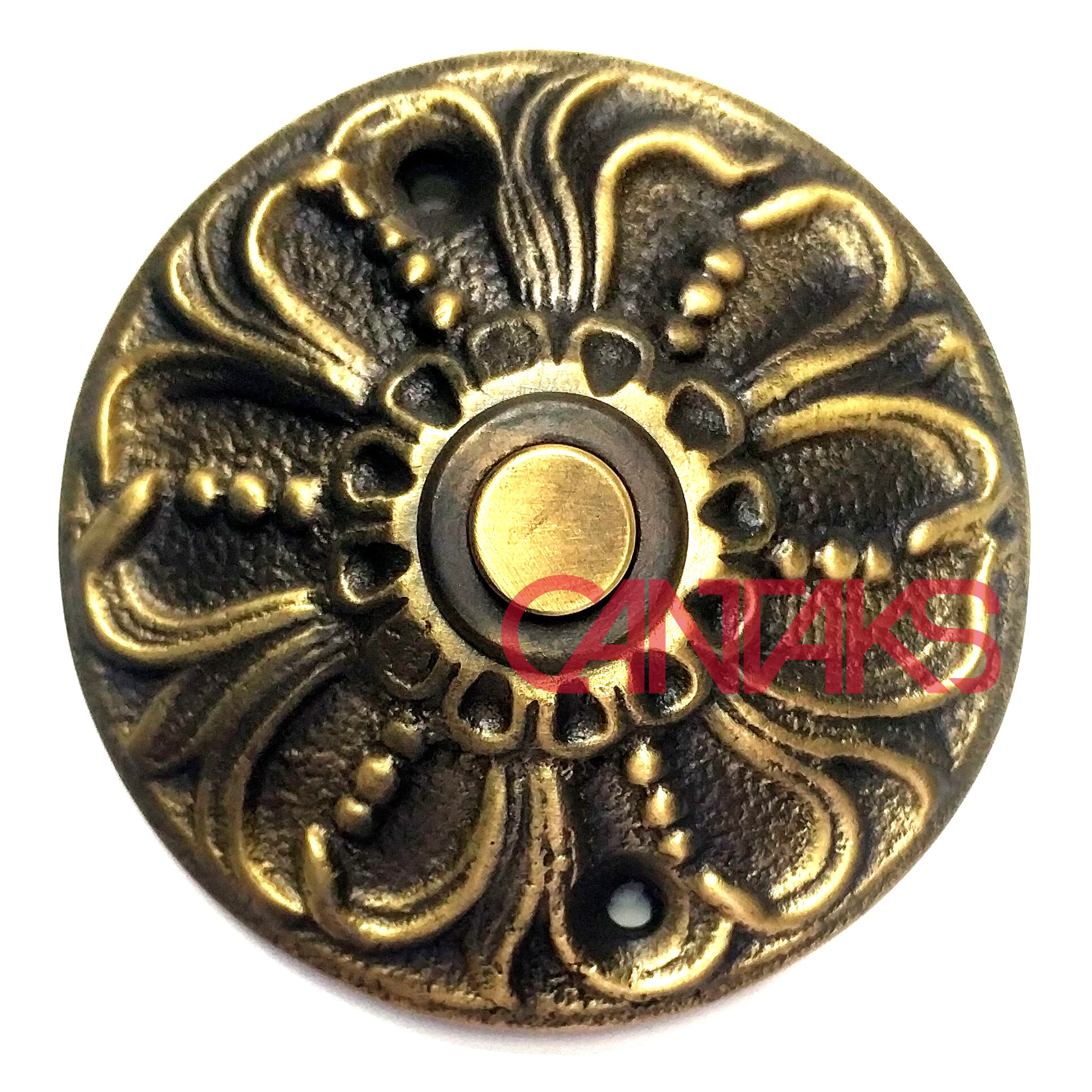 İç-dış mekan kullanımına uygun, dekoratif, butonlu kapı zili. Sarı pirinç malzemeden üretildiği için paslanmaz, çürümez. El işçiliği olduğundan çok ufak da olsa farklılıkları olabilir.